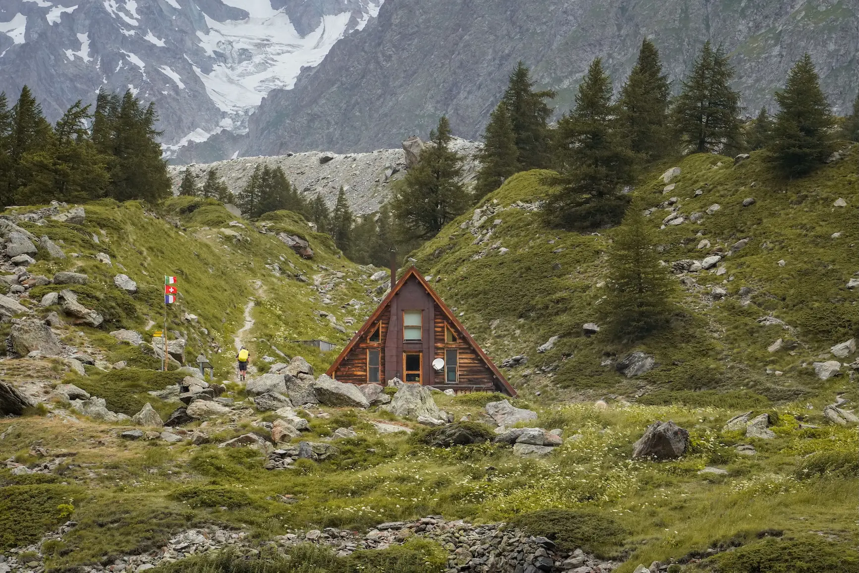Au départ de la charmante ville de Courmayeur, vous entamez une journée sur les sentiers italiens avant de basculer vers la Suisse. Les paysages alternent entre névés persistants et prairies alpines fleuries. C’est ici que nos groupes du Mont Blanc Trail adorent faire leurs plus belles photos !